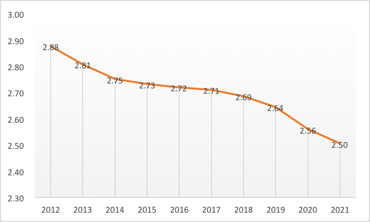 图五 我国居民人均可支配收入相较人均GDP的变化:2012-2021