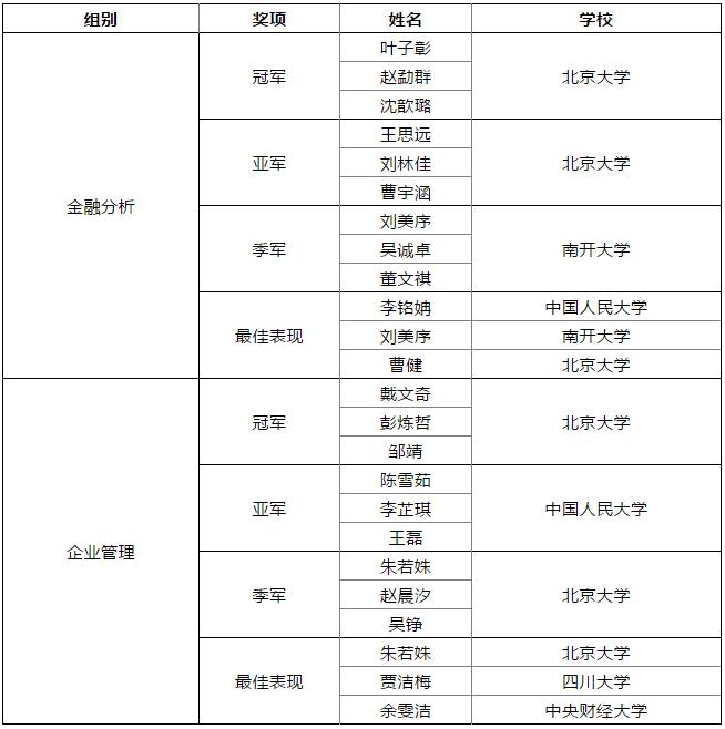 最终,来自北京大学、中国人民大学、北京师范大学、南开大学、中央财经大学、东北财经大学、西南财经大学、中南财经政法大学、四川大学、对外经济贸易大学、大连理工大学的10支金融分析组参赛团队和9只企业管理组参赛团队晋级决赛。