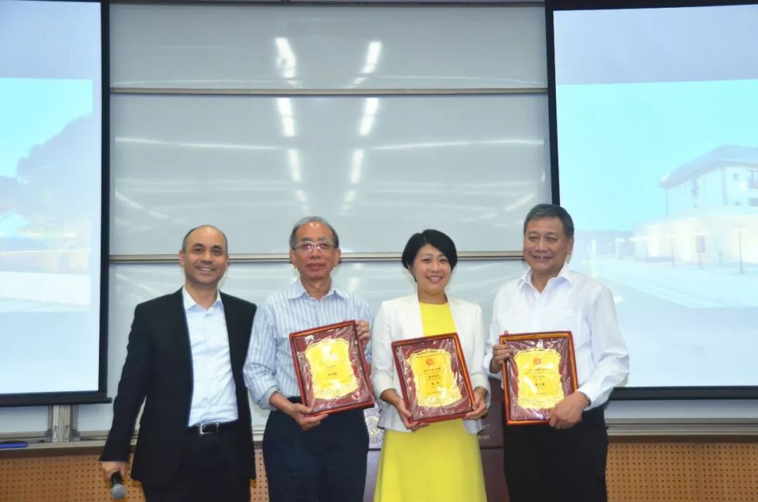 泗清教授为嘉宾颁发纪念奖牌(右一至右三分别为陈进强先生、陈芳女士、李润基先生)