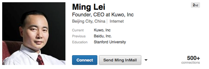 怎么样,是不是已经有内定的小心愿了?告诉你个小秘密,酷我音乐的总裁93级雷鸣师兄早就有LinkedIn啦,有志开发在线音乐网站的同学可以注册并登录LinkedIn领英,搜索下面的Profile,直接与他联络,面试前与企业CEO成为朋友不是梦!