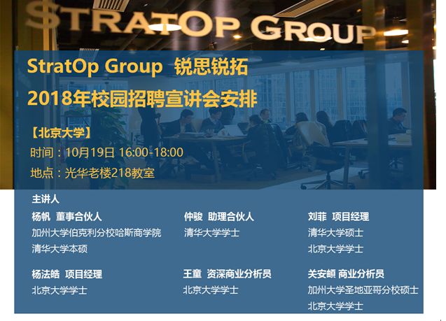 During the presentation, the firm’s partner will introduce our corporate culture and future development. Senior consultants will talk about their working experience and personal development. Meanwhile, our young Peking University and Tsinghua University alumni will share with you their experiences asveteran job-hunters and freshmen consultants. We hope this activity will help you betterunderstand consultingas a profession andour firm StratOp Group, and inspire you of more perspectives on your own career development.