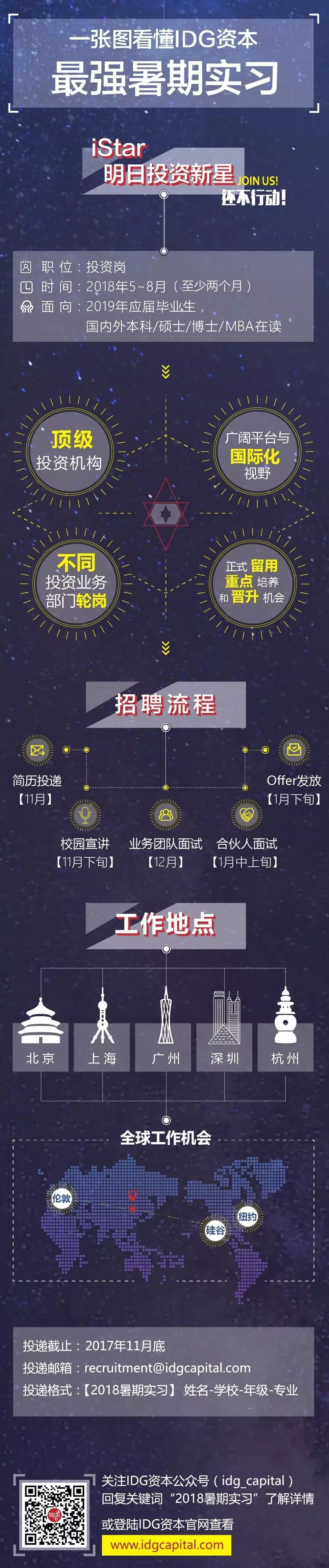 IDG资本HR:画重点→暑期实习的唯一通道是,投递简历到指定专属邮箱:[email protected]。投递格式为:【2018暑期实习】姓名-学校-年级-专业,中英文均可。