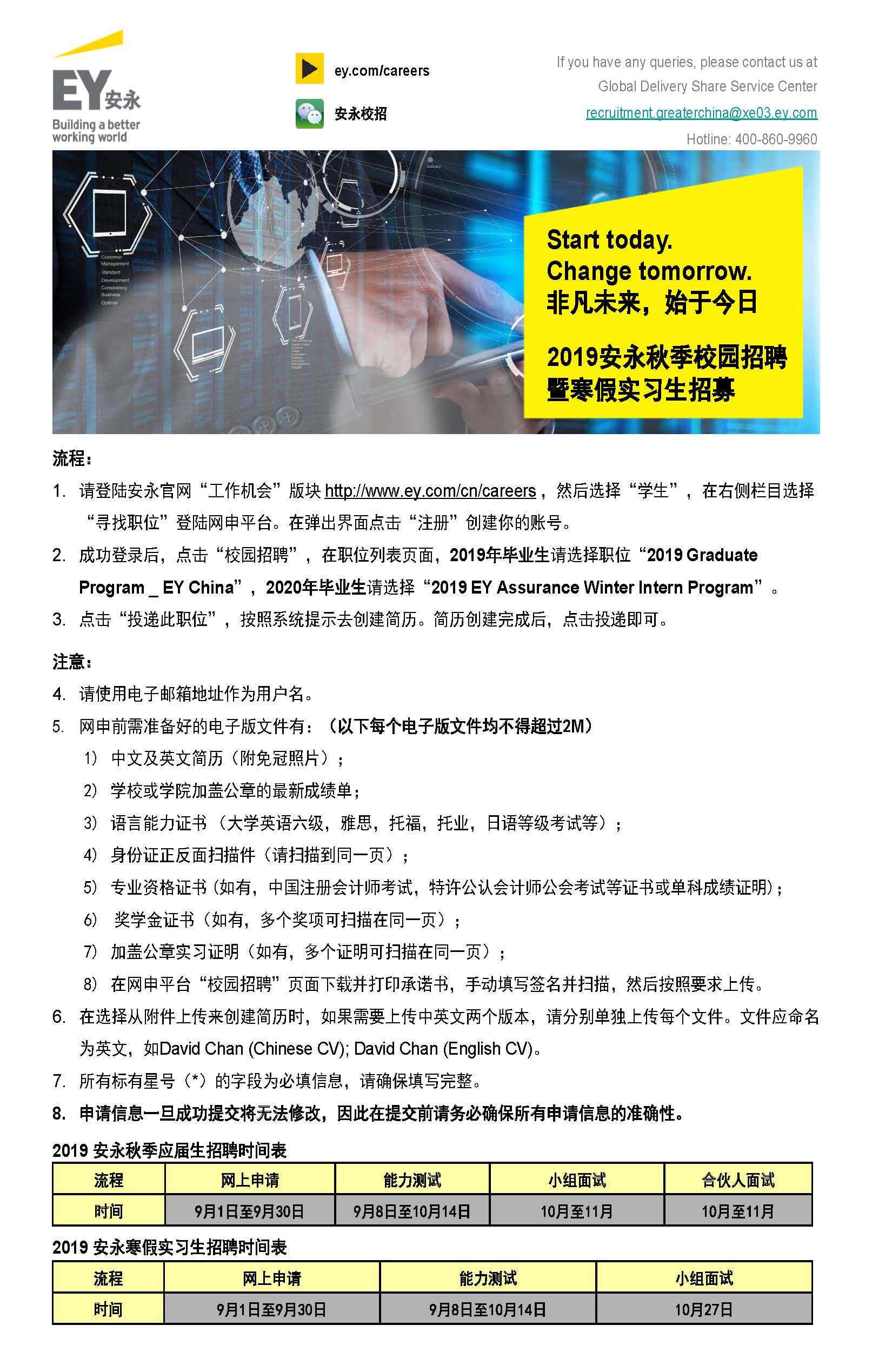 即日起,只要你是2019年毕业的中国全日制高校在读本科或研究生、并有志于专业服务领域,我们诚邀你参加安永秋季校园招聘系列活动,开启最具潜力的职业生活。