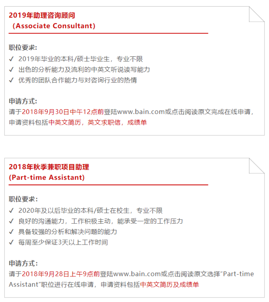 不管你是2019年应届本科/硕士毕业生,还是2020年及以后毕业的在校生,如果你有志于从事咨询行业,在世界顶尖平台上历练和闯荡,贝恩公司将是你绝佳的职业起点。论行业实力,贝恩荣膺福布斯2018年美国最佳管理咨询公司;论员工关怀,贝恩斩获Glassdoor 2018最佳雇主榜单亚军。
