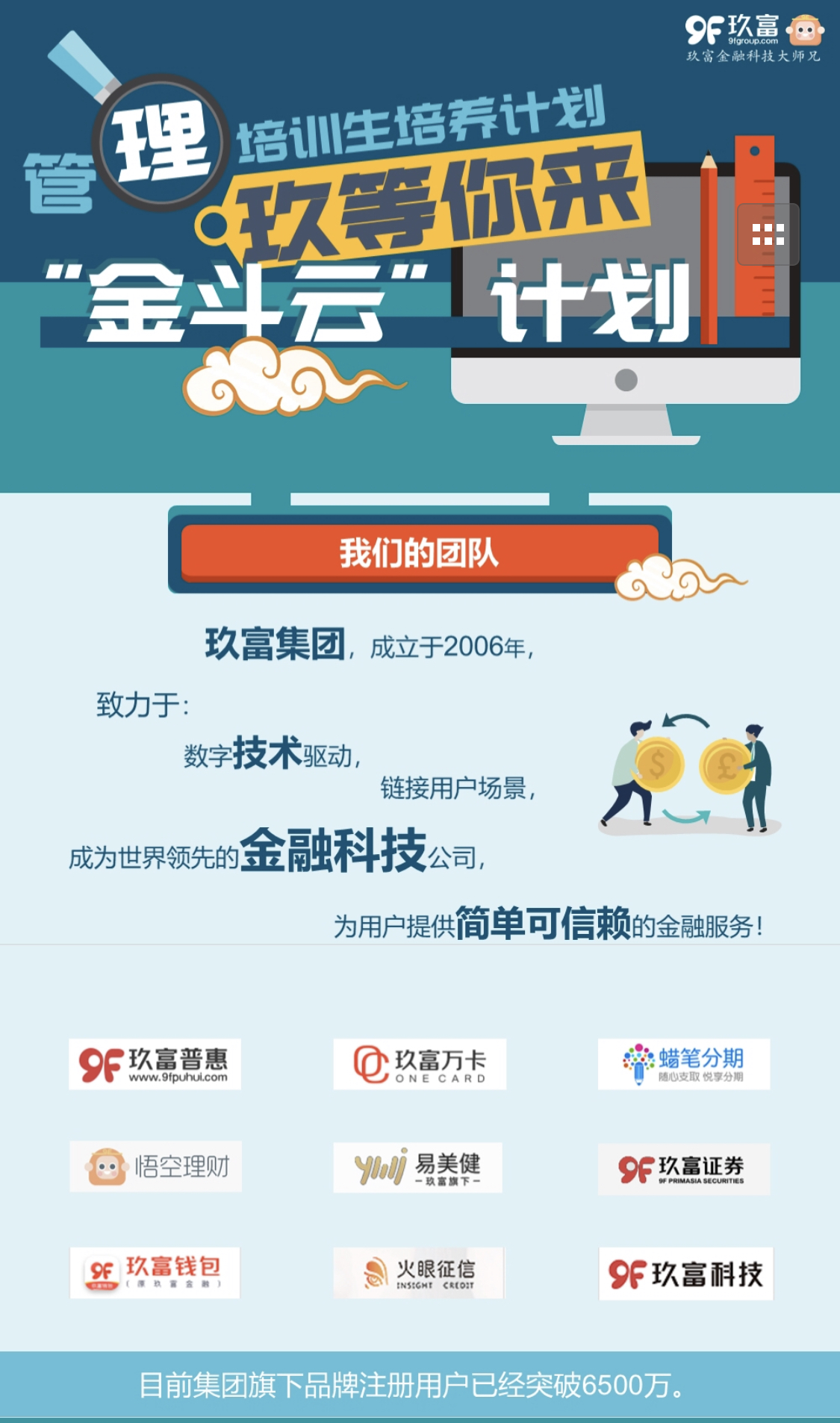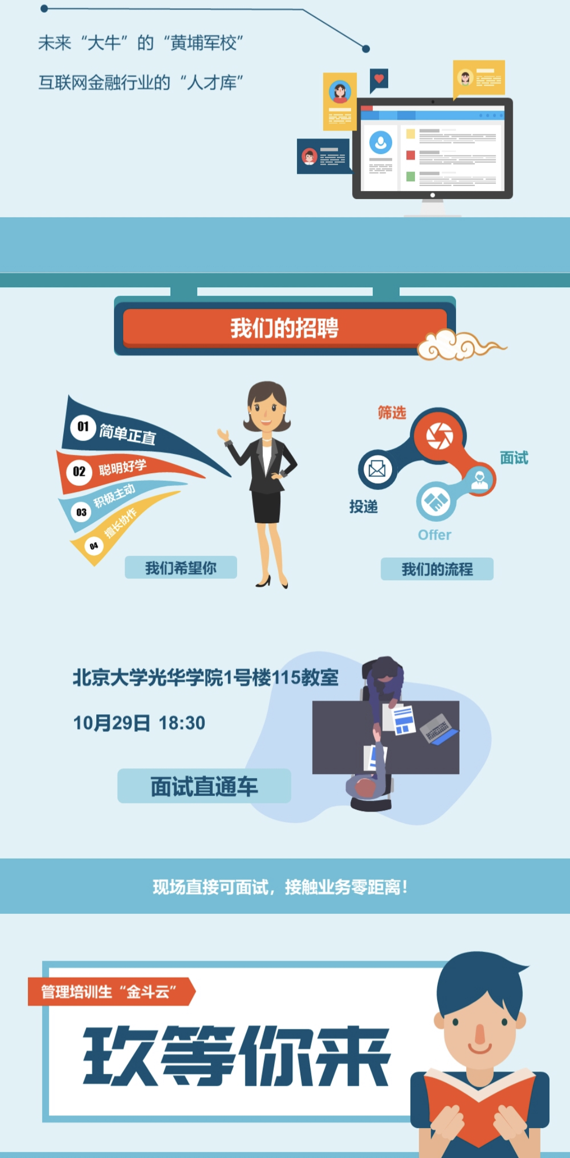 玖富集团(北京)招聘管培生,要求2019应届985/211院校毕业生,本科及以上学历,金融、计算机、信息技术、数学、统计学等相关专业优先。管培生项目已培育出十多位CEO及行业内企业高管,量身定制化培训,豪华双导师指导,核心业务轮岗,而且资源完全倾斜,玖等你来~投递邮箱:邮箱:[email protected] 另外1 另外10月29日18:30在成人直播 1号楼115教室有面试直通车活动,现场直接可面试,接触业务零距离,等着你哟~