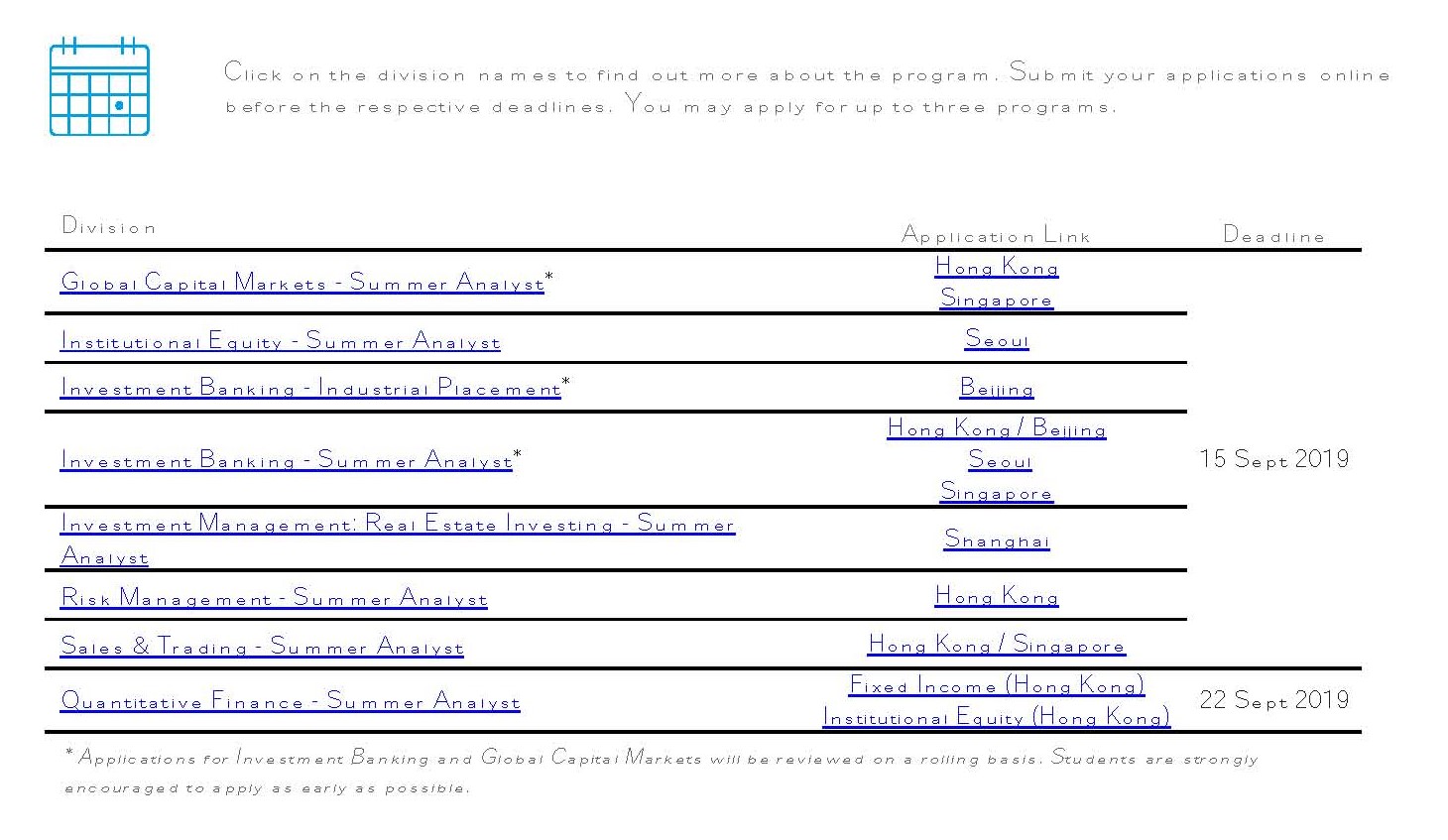 • Summer Analyst Programs: Ideal for candidates who are interested in our 10-week summer internship from