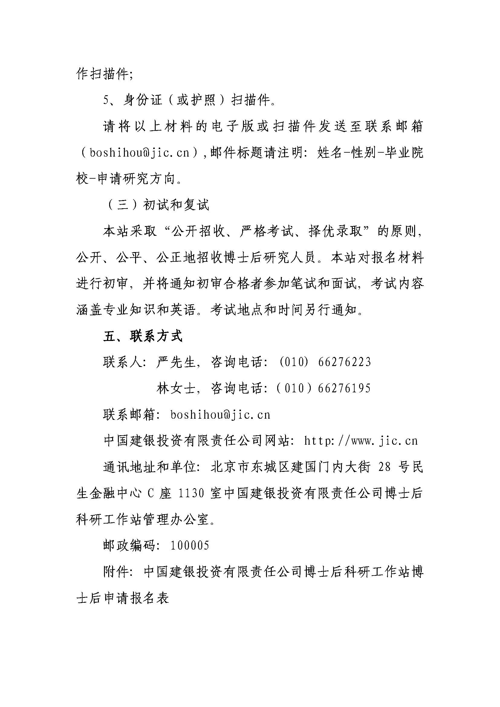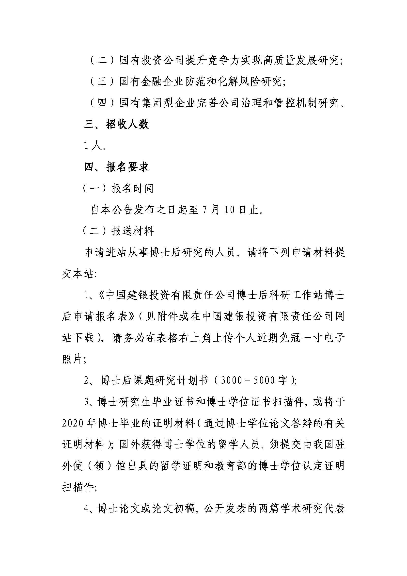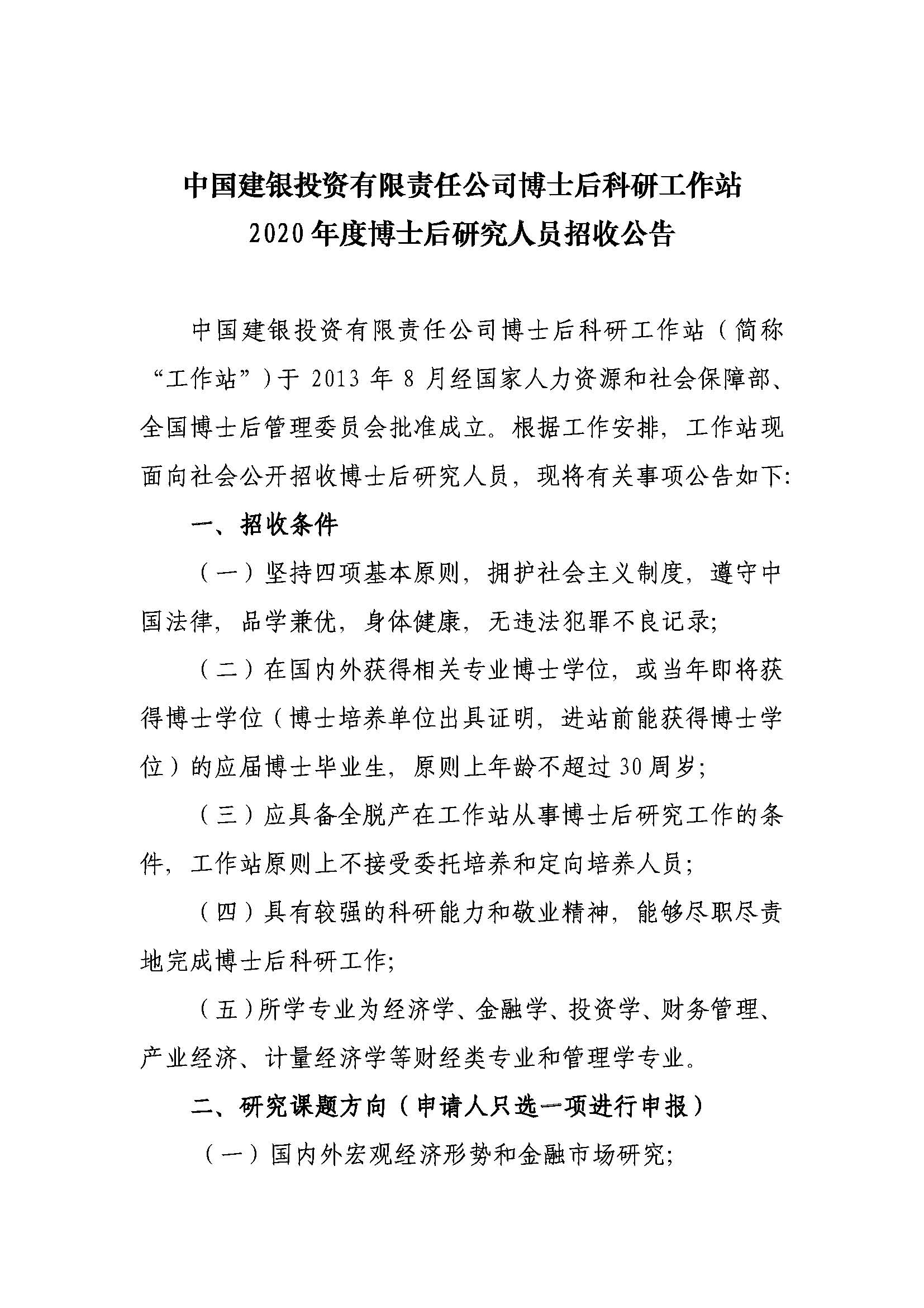 中国建银投资有限责任公司博士后科研工作站2020年度博士后研究人员招收公告