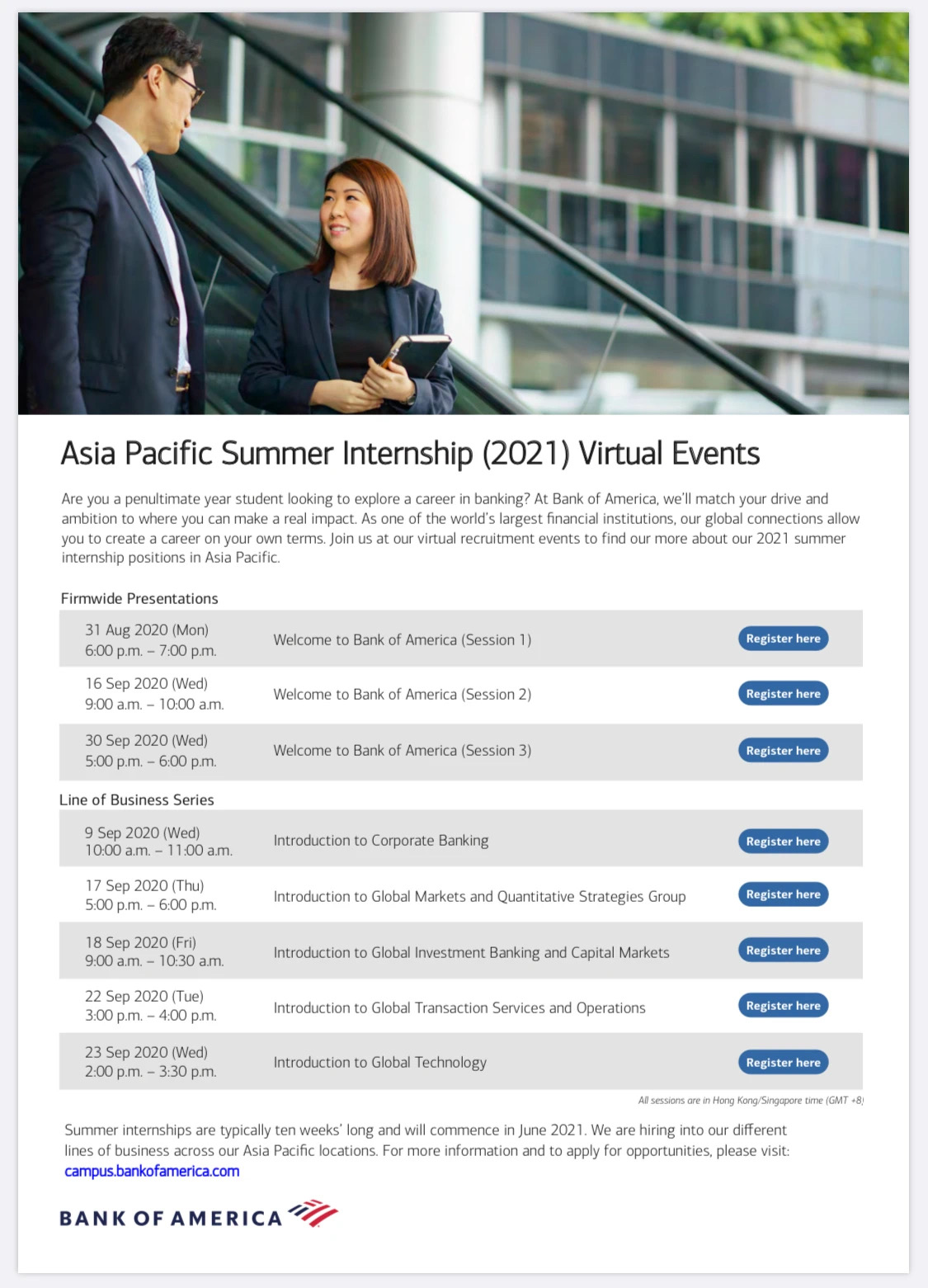 Bank of America Asia Pacific Summer Internship Virtual Events