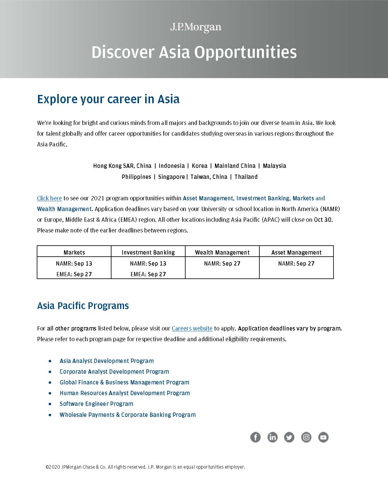 详情链接://careers.jpmorgan.com/us/en/students/programs?search=&tags=location__AsiaPacific__HongKongSARChina___location__AsiaPacific__Australia___location__AsiaPacific__TaiwanChina___location__AsiaPacific__Malaysia___location__AsiaPacific__MainlandChina___location__AsiaPacific__Thailand___location__AsiaPacific__Vietnam___location__AsiaPacific__Philippines___location__AsiaPacific__India___location__AsiaPacific__Indonesia___location__AsiaPacific__Singapore___location__AsiaPacific__Japan___location__AsiaPacific__SouthKorea