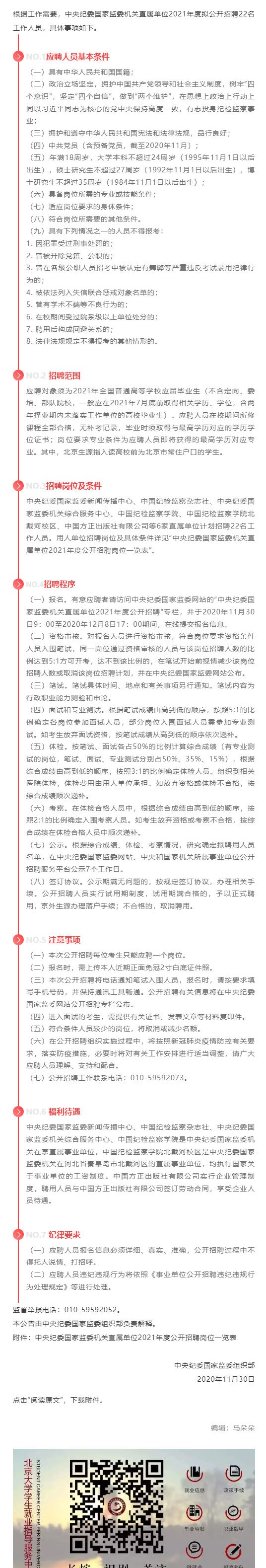 中央纪委国家监委机关直属单位2021年度公开招聘工作人员