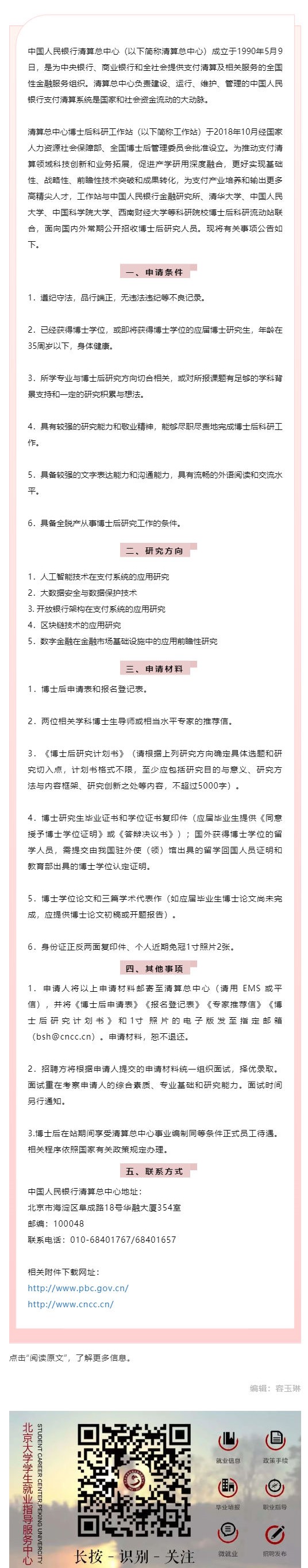 中国人民银行清算总中心博士后科研工作站2021年度博士后招收简章
