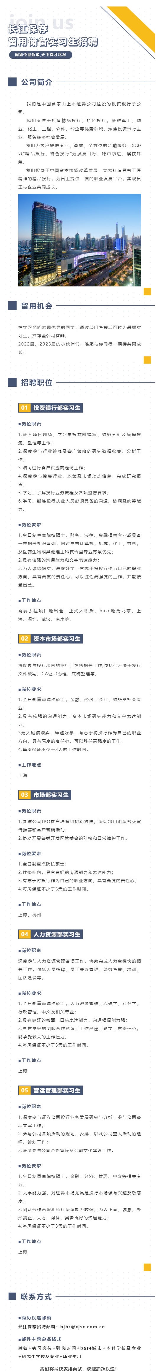 长江保荐:留用储备实习生招聘