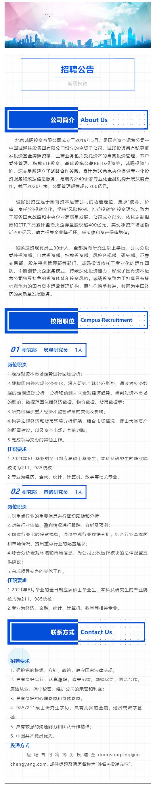 北京诚旸投资有限公司(中国诚通控股集团有限公司全资子公司)校园招聘