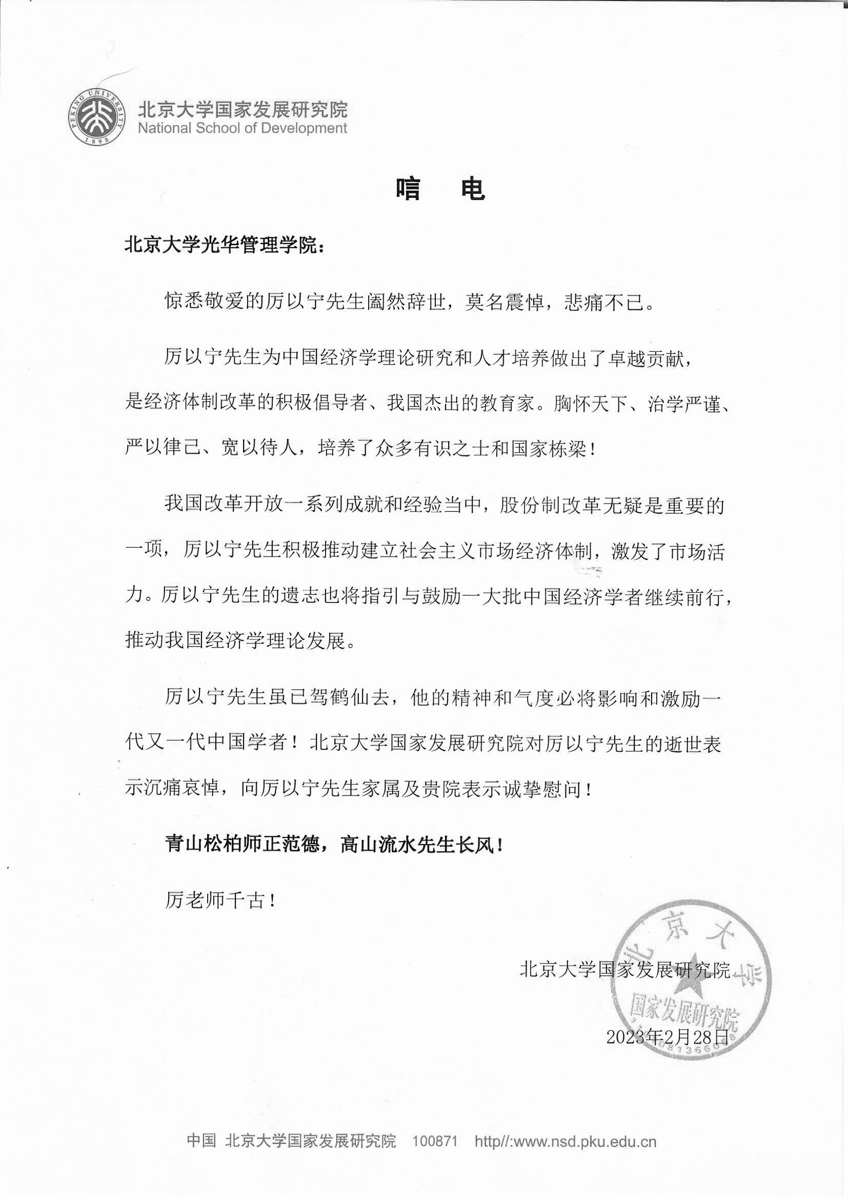 北京大学国家发展研究院唁电