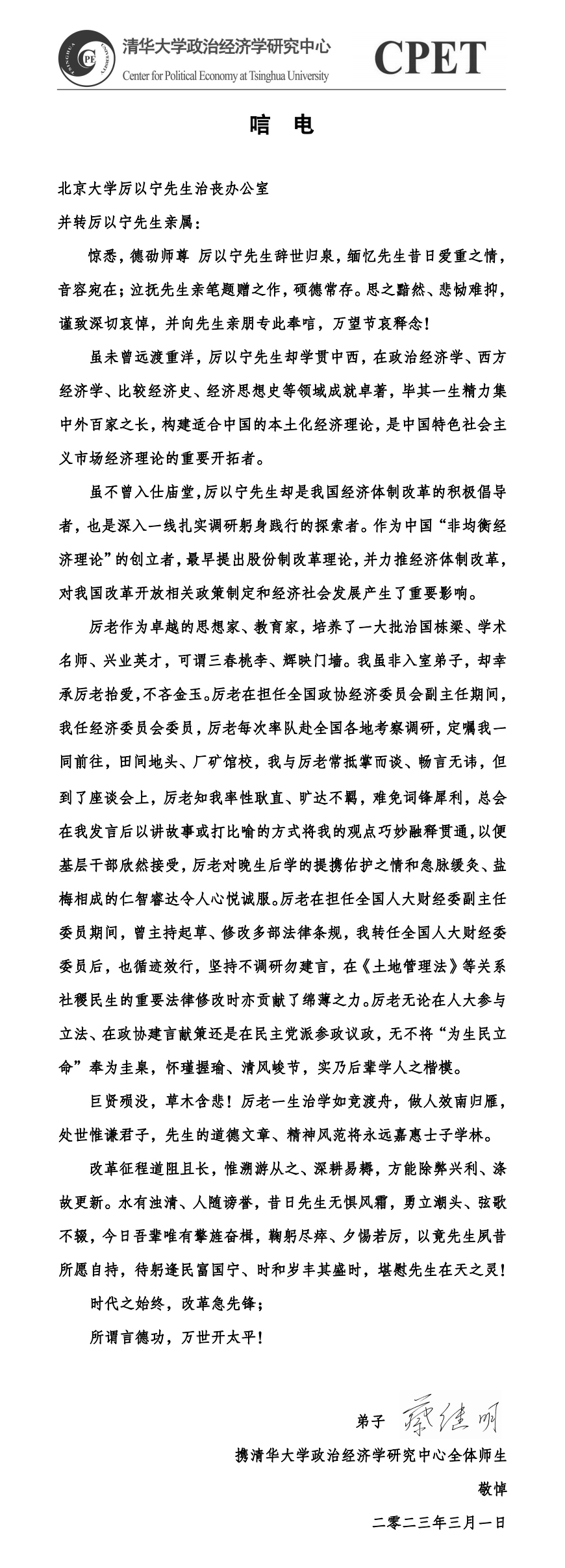 清华大学政治经济学研究中心唁电