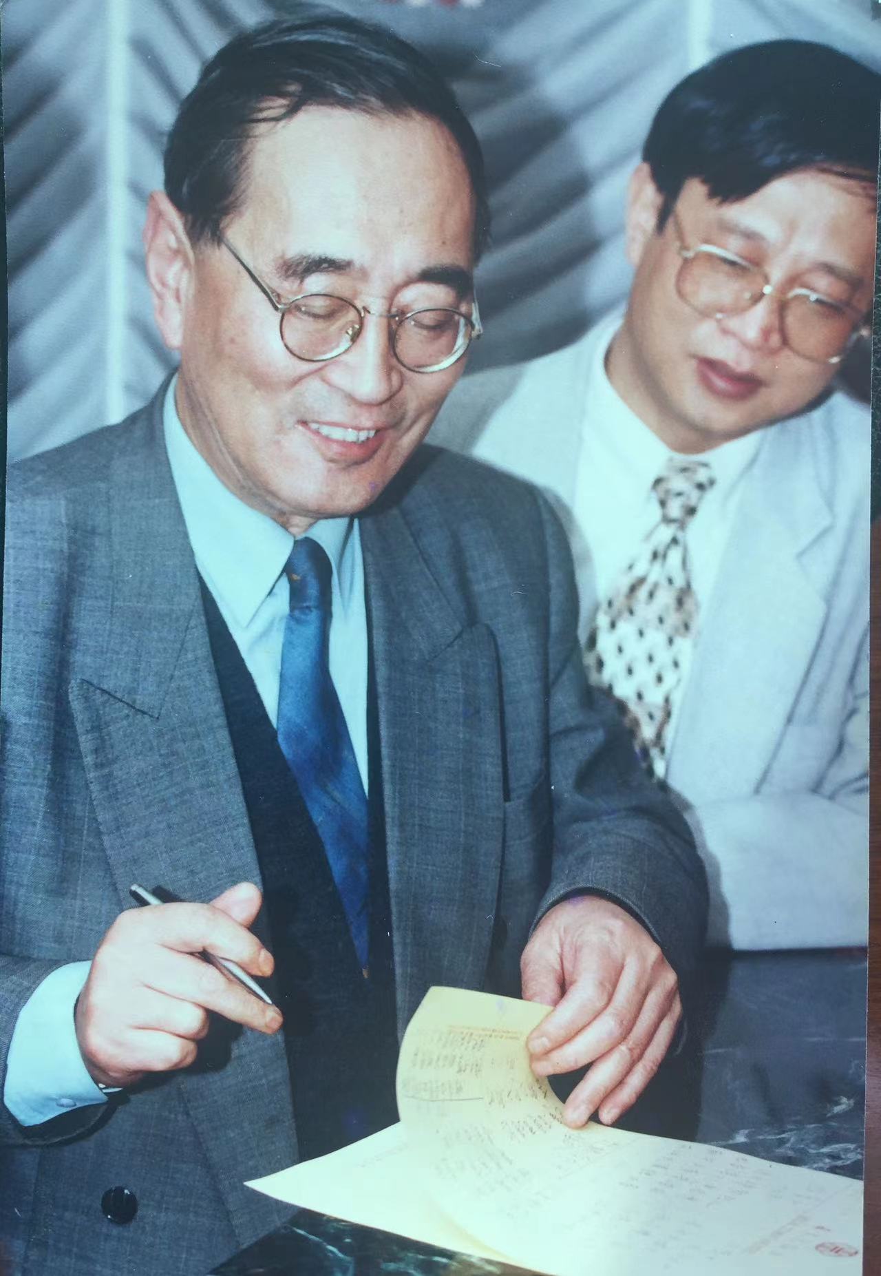 厉以宁老师和学生黄湘平同为第九届全国人大代表,厉老师为学生写的降低证券交易印花税的建议议案联合签名