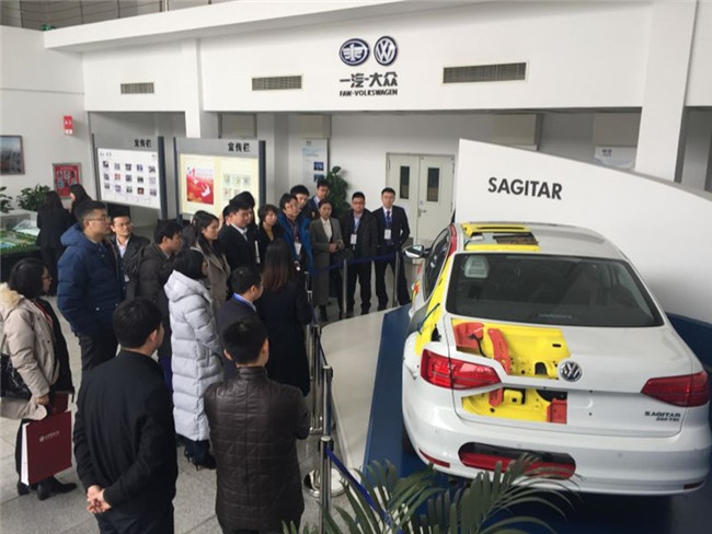 速腾生产节拍为60秒,即每分钟便有一辆速腾新车下线。整车生产涉及许多环节和工序,每一道工序都不超过60秒,从而保证节拍的准确性。在车间里我们观看到了速腾车架与车身一次性结合的“婚礼”全过程,这是整车装配的最关键一步,体现了高度自动化机器人的精确度和工程师的精湛工艺。在参观过程中同学们惊讶地发现流水线上的车居然是五颜六色的,原来一汽已经可以根据用户的需求实现个性化定制喷漆颜色及配置,从而可以避免生产与用户需求脱节。整车厂的所有机器和零部件都与德国大众对标,中国自主加工的零件比例已经达到90%,并且做到了零库存管理,即所有的零件在两小时之内用完,物料运输车源源不断地补充输送着所需物料,有效降低库存成本。