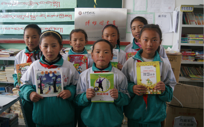 西藏从1985年开始对农牧民子女实行包吃包住包学习费用的“三包”政策,塔杰乡也实现了100%的义务教育普及率。此次走访的塔杰乡完全小学是寄宿小学,附近几个村的农牧民子女在这里上学,不仅有259名小学生,还有90余名学龄前的幼儿园小朋友。学校在群山中的凹地里,藏语和汉语夹杂着的朗朗读书声在我们进入学校大门的时候就飘了出来。这是由EMBA 65班校友在西藏达孜县的乡村小学捐赠的第三所博雅图书室了。去年,该班的同学捐赠了章多乡完全小学和唐嘎乡完全小学,每所学校平均捐赠折后约5万元的3000册新书,包括教学参考书、工具书、课外读物,教师用书等,这次在塔杰完小,还特别为幼儿园的小朋友订购了适合他们阅读的图画书和拼音读本。
