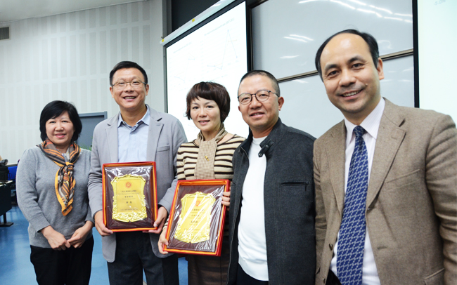 为李杰博士(左二)、吴彦群博士(左三)颁发纪念奖牌