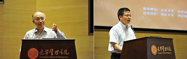 开营主题演讲:北京中坤投资集团董事长黄怒波校友(右)、北京大学原副校长张国有教授(左上)、