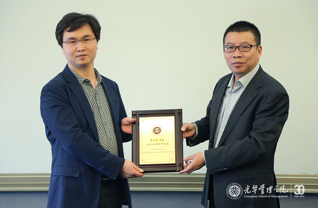 随后,龚六堂副院长代表学院与葛小松先生签约。为感谢葛小松先生对教育事业及公益事业的支持,感谢他为学生成长所做的贡献,特为他颁发北京大学教育贡献奖,并聘请他为成人直播