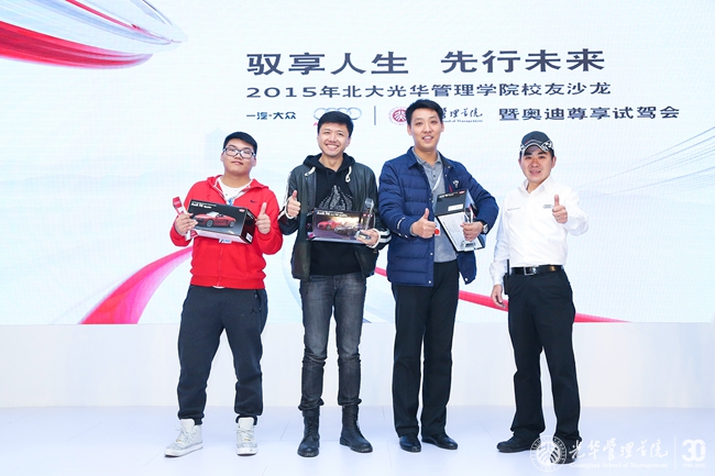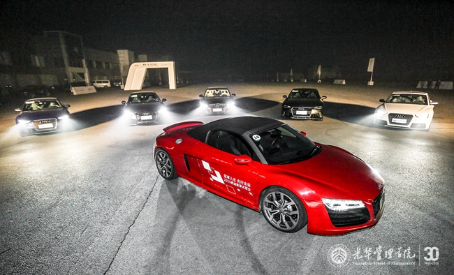 在活动特别设置的趣味竞技环节,EMBA校友李明先生以最短时间将车泊位到指定位置而夺得比赛冠军。而随后的飘移表演更是将活动带向高潮,6位奥迪驾控汇专业教练驾驶奥迪R/RS系高性能车在夜色中伴随声光特效给来宾上演了一场精彩的车舞表演。