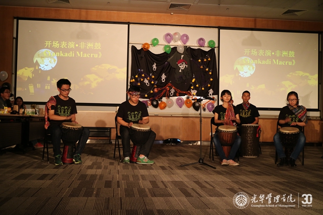 晚会以非洲鼓表演Yankadi Macru开场,伴随着动感十足的音乐,观众们有序进场入座。接着,两位主持人盛装登场,在欢声笑语之中,万圣节晚会正式开始。