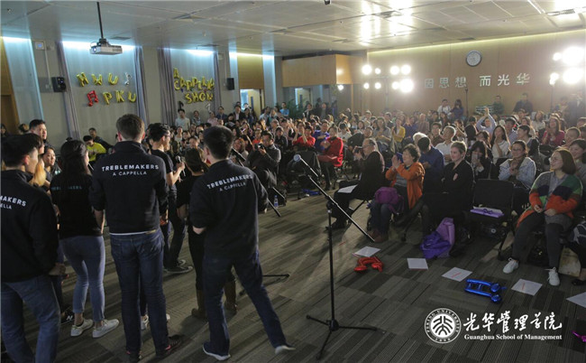 晚上七点半的203多功能厅座无虚席,Tremblemkers以经典曲目Sun and Moon拉开了演出的序幕。随后,他们带来了婉转悠长的Fly Me to the moon,博得了观众的阵阵掌声。北大阿卡贝拉乐团SEAbling则演唱了清新悦动的《情非得已》。