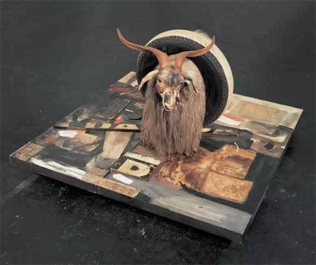 ▲罗伯特•劳森伯格(1925–2008),《合体字》,1955–1959。混合体:油彩、纸、布料、印刷品、照片冲印副本、金属、木材、橡胶鞋跟、网球、帆布、橡胶轮胎、安哥拉山羊标本、木台、四个脚轮,106.7 x 160.7 x163.8 cm。斯德哥尔摩当代美术馆。现代美术馆赞助理事会于1965年购入©罗伯特•劳森伯格基金会。