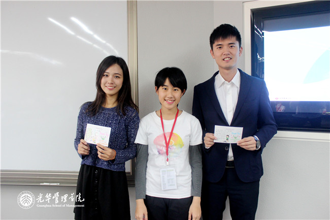 同学代表向潘援老师和卢欣临学姐赠送纪念明信片