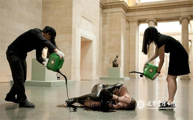 艺术家团队“解放泰特”(激进派艺术家组织) 为了抗议泰特美术馆从英国石油公司获取资金事件,在未给予任何告知的情况下,在美术馆的中央上演了一幕将石油/油画颜料泼在了一个裸体的抗议者身上的行为。