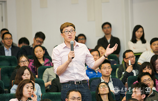 接下来姚长辉教授带来以“资本市场的繁荣与企业的成长壮大”为主题的演讲,姚老师首先讲了我国资本市场的现状,我国的负债率高,负债期限短,这大大阻碍了企业构建长远战略。姚老师结合时下红火的股票市场展开,他说繁荣的股票市场有助于打通企业的权益融资,而繁荣的债券市场特别是长期债券市场将改善企业的债务期限结构。在普通的金融环境中,企业依靠内源融资实现成长,而在资本市场繁荣的大背景下,企业的长期融资被打通,企业也大大拓展了并购范围和能力,这两者都将给企业带来壮大自己的机会。演讲的最后,姚老师展望到,繁荣的资本市场,将塑造出多个巨型企业,这也将使更多的企业家构建更宏大的梦想,而企业家宏大的梦想将引领中国经济走向更大的繁荣。
