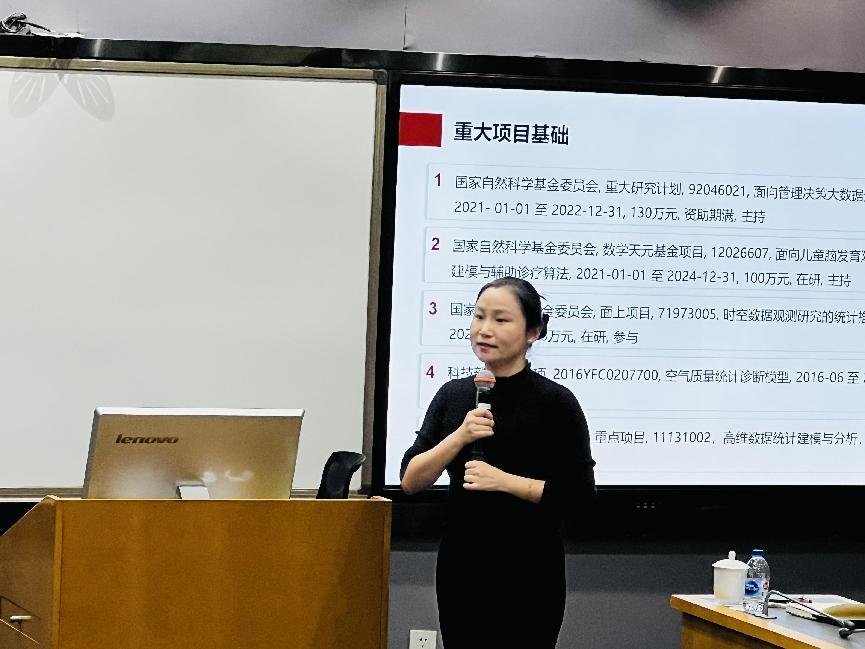 最后,徐老师对本学科方向的重大项目基础进行介绍。第一,本团队成员在陈松蹊的带领下完成的由国家自然科学基金委员会资助的《面向管理决策大数据分析的理论与方法》这一重大研究计划已经资助期满,并取得了圆满成功;第二,本团队成员参与的《面向儿童脑发育障碍性疾病的神经机制建模与辅助诊疗算法》这一数学天元基金项目和《时空数据观测研究的统计推断》这一面上项目的研究正在有序推进,目前为止进展顺利;第三,团队成员也圆满完成了国家自然科学基金委员会资助的《高维数据统计建模与分析》这一重点项目和科技部重点专项项目《空气质量统计诊断模型》的研究任务。在这些重大项目的研究过程中,团队的合作能力得到了有效发展,工作能力得到了切实锻炼,更多项目正在有序开展,未来研究实体正在不断壮大。