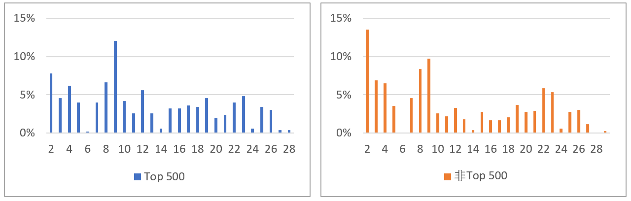 从上市时间看,资历深浅不同的公司在Top500内外均有所分布。Top500公司平均上市年限为12.4年,非Top500公司的平均上市年限为11.7年,略微偏低(图14)。
